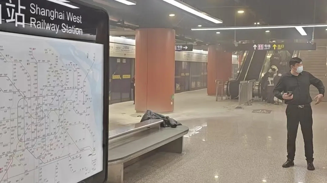 从监控画面可见,该搭客从站厅层乘手扶梯下行至站台层时,其外衣一侧已冒出明火。站台候车搭客发觉后,敏捷向一侧遁藏。